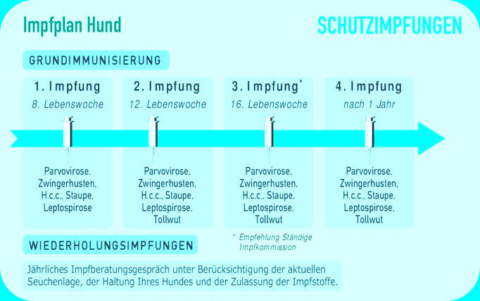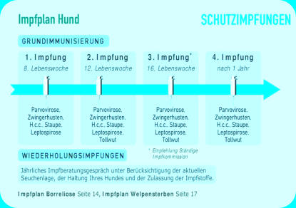 Infektionskrankheiten vorbeugenab 8 WochenImpfung gegen Staupe (S), Hepatitis (H), Parvovirose (P), Parainfluenza(Pi), Leptospirose (L)ab 12 WochenImpfung gegen Staupe (S), Hepatitis (H), Parvovirose (P), Parainfluenza(Pi), Leptospirose (L) und Tollwut (T)ab 16 Wochen(Stlko Vet. Impfempfehlungen)Impfung gegen Staupe (S), Hepatitis (H), Parvovirose (P), Parainfluenza(Pi), Leptospirose (L) und Tollwut (T)Bitte beachten Sie die jährliche Auffrischung!StaupeDie Hunde-Staupe ist bereits seit dem 18. Jahrhundert bekannt. Der Erreger der Hunde-Staupe ist ein Virus. In Deutschland ist die Staupe dank der regelmäßig bei Hunden durchgeführten Impfungen selten geworden.Doch vereinzelt treten immer wieder Erkrankungsfälle auf, meist bei ungeimpften Hunden. Die Ansteckung durch das Staupe-Virus erfolgt über Mund oder Nase des Hundes. Nach drei bis sechs Tagen kann dann Fieber auftreten. Später greift das Staupe-Virus verschiedene Organe im Körper des Hundes an. Dazu gehören der Verdauungs- und der Atmungsapparat, die Augen, die Haut und das Nervensystem.HepatitisDie ansteckende Leberentzündung tritt nur noch selten auf, weil die meisten Hunde regelmäßig durch eine Impfung geschützt werden. Das Virus wird nicht nur von Hund zu Hund durch Speichel, Harn oder Kot übertragen, sondern auch indirekt durch den Kontakt mit infizierten Gegenständen. Die Hunde können manchmal innerhalb weniger Stunden sterben, ohne dass der Tierhalter vorher etwas bemerkt hat. Symptome der Erkrankung sind Fieber, Mandelentzündung mit Lymphknotenschwellung, starke Bauchschmerzen, Lungenentzündung und Störung des zentralen Nervensystems. In der Heilungsphase können graue Hornhauttrübungen auftreten.LeptospiroseDie Erreger der Leptospirose, die Leptospiren (Bakterien), werden von befallenen Hunden oder anderen Tieren (zum Beispiel Ratten) mit dem Harn ausgeschieden und sind besonders in feuchtem Boden und in Gewässern sehr lange lebensfähig. Nicht nur Hunde und andere Tiere können sich anstecken, sondern auch der Mensch. Deshalb zählt man die Leptospirose zu den Zoonosen (Krankheiten und Infektionen, die natürlicherweise zwischen Wirbeltieren und Menschen übertragen werden).Die Leptospiren werden über die Schleimhäute des Verdauungsapparates aufgenommen und können sowohl leichte, fiebrige Erkrankungen als auch schwerste, bis zum Tode führende Leber- und Nierenschäden hervorrufen. Die regelmäßige Impfung schützt nicht nur den Hund selbst, sondern auch die Menschen, die mit ihm zusammenleben, vor einer durch den Hund übertragenen Leptospireninfektion.ParvoviroseUrsache und Übertragung:Die Parvovirose des Hundes wurde im Jahr 1978 fast gleichzeitig in Europa, Nordamerika und Australien entdeckt. Der Erreger, das Parvo-Virus, wird von erkrankten Tieren massenhaft mit dem Kot ausgeschieden und ist in der Außenwelt sehr lange lebensfähig. Typische Ansteckungsquellen sind mit Kot beschmutztes Futter, Gegenstände und Kleider. Das Parvo-Virus wird über den Mund aufgenommen und siedelt sich in der Dünndarmschleimhaut an.Krankheitsanzeichen:7 bis 14 Tage nach der Aufnahme des Virus können die ersten Krankheitsanzeichen auftreten. Die auffallendsten Symptome, wässrig bis blutiger, stinkender Durchfall und Erbrechen, sind die Folgen einer Zerstörung der Darmschleimhaut durch das Parvo-Virus. Die erkrankten Tiere trocknen schnell aus, viele müssen trotz intensivster tierärztlicher Bemühungen sterben.Vorbeugung:In den ersten Jahren hat man Hunde mit dem für Katzen bestimmten Katzenseuchen-Impfstoff geimpft. Das war möglich, weil der Erreger der Katzenseuche mit dem Parvo-Virus des Hundes verwandt ist. Daher kommt auch die frühere Bezeichnung „Katzenseuche des Hundes“ für die Parvovirose. Inzwischen gibt es spezielle Impfstoffe für den Hund. Rechtzeitige Impfungen bieten einen guten Schutz gegen die Infektion mit dem Parvo-Virus. Die Erkrankungshäufigkeit ist zwar nicht mehr so groß wie zu Beginn der 80er-Jahre, trotzdem infizieren sich immer noch viele Hunde. Durch einen Schnelltest kann das Parvo-Virus in einer Stuhlprobe sicher nachgewiesen werden.Wenn sich der Schlendrian im Zusammenhang mit der Parvovirose-Schutzimpfung breit macht, führt das häufig zu bösen Überraschungen. Bitte fragen Sie Ihre Tierärztin/Ihren Tierarzt, zu welchem Zeitpunkt die Impfungen erfolgen sollten, um optimalen Schutz zu gewähren.TollwutUrsache und Übertragung:Eine der gefährlichsten Krankheiten für Mensch und Tier ist die Tollwut. Dank der Impfung von Haustieren und Füchsen ist es gelungen, die bis heute unheilbare Tollwut stark einzudämmen. Sie kommt aber immer noch gelegentlich vor. Hunde und Katzen können durch den Kontakt mit Wildtieren, hauptsächlich mit Füchsen, angesteckt werden. Mit dem Speichel oder beim Biss wird das Virus übertragen.Krankheitsanzeichen:Früher kam es zu dem typischen Krankheitsverlauf bei den Hunden, die sich „wie toll“ benahmen. Heute sehen die Symptome häufig anders aus. Infizierte Tiere verhalten sich über eine längere Zeit fast normal, sind ruhig und unauffällig. Dieser äußere Eindruck täuscht. Tollwutinfizierte Tiere sind äußerst gefährlich und der Umgang mit ihnen ist auf jeden Fall zu vermeiden.Erst nach Wochen und Monaten nach der Ansteckung kann es zu klinischen Symptomen kommen, die mit Juckreiz, Speichelfluss, Unruhe und Beißwut auf Tollwut hinweisen können.Vorbeugung:Die einzige Maßnahme, die unseren Hund vor einer Tollwuterkrankung sicher schützt, ist die vorbeugende Impfung. Denken Sie bitte auf jeden Fall daran: Eine Auslandsreise ist ohne EU-Reisepass mit Impfnachweis gegen Tollwut nicht möglich.ZwingerhustenUrsache und Übertragung:Anders als der Name vielleicht fälschlich vermuten lässt, können nicht nur im Zwinger gehaltene, sondern auch in Wohnungen lebende Hunde an Zwingerhusten erkranken. Als Erreger des Zwingerhustens kommen gleich eine ganze Reihe verschiedener Viren und Bakterien in Frage.Die Ansteckung erfolgt über 